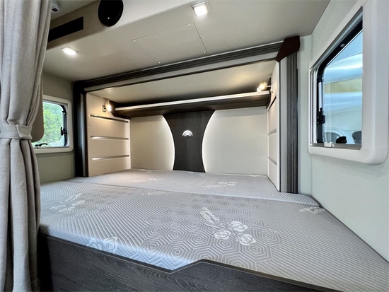 内饰是烟熏橡木的装饰,色调柔和,阐述了简约美学。顶部漫天星辰的星空顶为车子也增加了浪漫的色彩,为旅居生活增添了不同的颜色。宽大的会客厅,四人的卡座,皮质包覆,触感柔软,还能瞬间变成沙发床。餐桌还有杯托,顶部设置了储物柜,释放了更多的空间,同时,会客厅的四向移动可升降的桌子, 能满足吃饭,会谈,娱乐等多种功能。