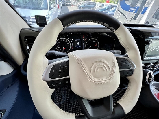 驾驶舱内,主副驾座椅采用了浅色皮革+布艺包覆,和后面生活区的配色相呼应,使得车内整体更加的协调和统一,皮质软包的工艺也突显了精致感。里面也配置了多功能方向盘、主副驾安全气囊、主副架座椅空气悬挂3向调节座椅电加热、ESP车身电子稳定系统、倒车雷达、倒车影像、定速巡航、电动电热后视镜等设备,让行车驾驶更加安心、轻松。