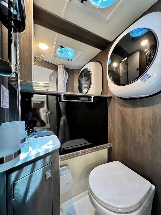 厨房区域分工明确,隐藏式的水龙头,带挡板的深水槽,置物架餐具收纳抽屉,一应俱全,让烹饪也有乐趣可言。大冰箱和微波炉作为厨房的重要物件,自然必不可少。卫浴区采用独立的卫生间,配置有电动粉碎马桶、双向换气扇、淋浴花洒,毛巾杆、浴室镜、手纸盒、卫浴帘、挂衣钩、洗手盆、吊柜,晾衣绳,暖风出风口、洗衣机等基础设施,并且配备130L净水箱+ 90L副水箱;70L灰水箱+电动/手动排污阀满足我们日常用水问题!