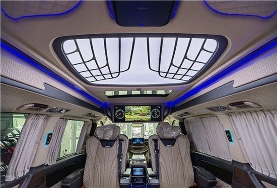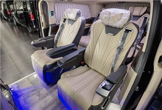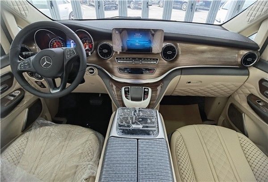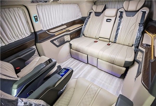 此款奔驰v260L全隔款内饰用料及做工达到顶尖豪车水准,集舒适、配置、娱乐于一体,旨在为尊贵的车主打造高端、高品质的接待与移动办公出行。全车内舱皮质包覆,全新设计的亚克力导光LED顶灯、镀铬装饰星光LED壁灯,融合高光典雅的钢琴烤漆装饰,营造宽阔豪华的氛围。第二排为两个独立航空座椅,不仅座面宽大舒适而且内部填充高密度海绵久坐不变形。