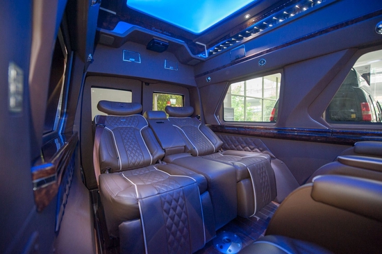 GMC商务车具有着扎实的外形,加高的车顶、运动型大包围、棱角清楚的线条和健硕的脸部肌肉。车头左右都有豪车标配的氙气大灯和LED氛围灯。十分的高端大气漂亮。车轮为20英寸的超大轮毂,这样显得车身十分的高大霸气,开出去必定回头率特别的高,显贵身份尽显无疑。像奔驰斯宾特这样的房车,轮毂才有17英寸。