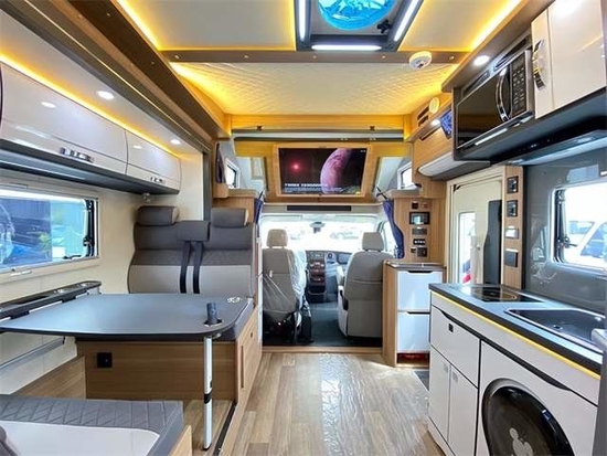 内部采用的是灰色的设计风格,同时布局简约明了一点也不繁杂;上门处右方是电器集成控制面板与物理按键方便我们的日常操作。额头区域设有额头床,足够两人日常休息使用,娱乐部分采用的是极米投影幕布和音响,带来了影院级的视听感受。会客区部分采用L型沙发卡座设计,在有需要的情况下可以拼成沙发床,空间利用率十分合理,厨房区域配置齐全,配有电磁炉、洗水槽、微波炉、冰箱储物柜等。