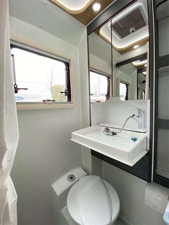 卫浴间紧挨厨房,半吸塑工艺的独立卫生间拥有良好的防水防漏系统,由于内置多面镜子,在灯光的衬托下显得空间格外通透。内部设备也一应俱全,多美达专用坐便器、带防水盖板的电源接口、毛巾架、梳妆镜、淋浴花洒等,可充分满足您与家人在旅途中的洗浴需求。车上配有燃油暖风一体机,可为您24小时不间断供应热水,使您纵享温暖旅途!