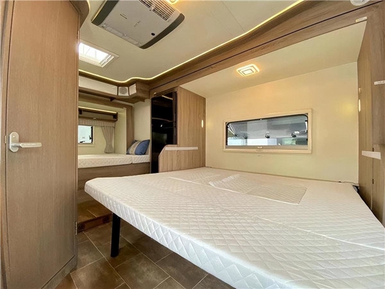 卡座采用四人对坐的方式,座椅根据人体工程学设计,内部多种不同软硬度填充材料,较厚的发泡材料填充不仅带来移动会客厅的坐享舒适,并且在高速行驶时对人体的支撑和保护更加到位。车内最大的亮点在于拓展区配有一张侧拓展翻转双人床,顶部配有扳手,便于操作;可将靠垫随时拆卸,通过外侧延伸收纳床板可增加床铺使用面积,变为一张尺寸为1900×1900(mm)的超大固定床,同时配有豪华床垫,厚实回弹性好,提供舒适的质感;另外,收纳床板下方设有收纳支腿,使用时只需从固定扣卸下即可,牢固可靠,将生活区空间合理利用。