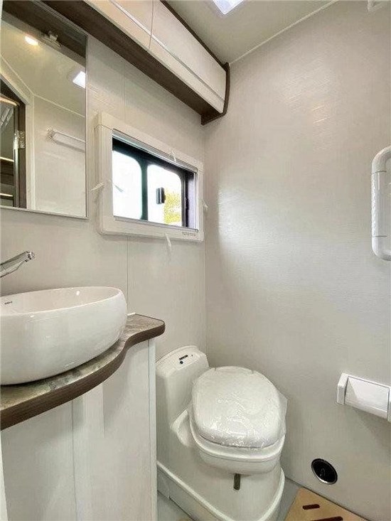 卫生间由SMC复合航空材料打造,整体式卫浴耐水防霉,内部的赛特福德可旋转式盒式马桶、洗手池、花洒、排气扇、透气窗、储物柜等一应俱全。水路配置上,净水箱为180L,灰水箱为45L手自双排。水路方面,新车配备180L净水箱、45L灰水箱,610Ah锂电+3000W逆变器+400W太阳能板将在用户中长旅居环境下提供电能。
