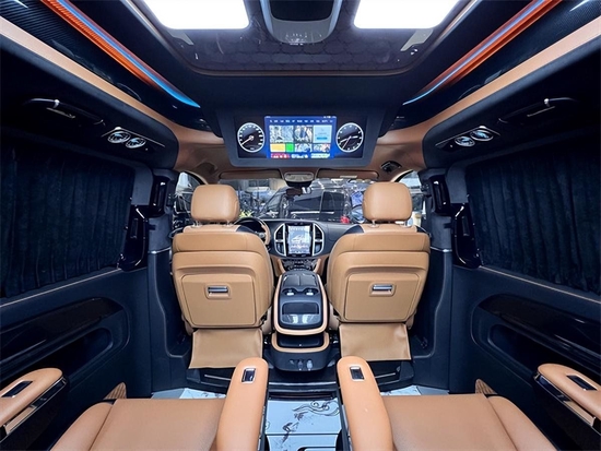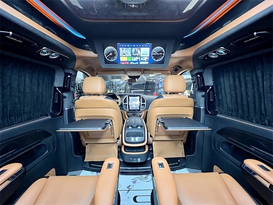 这样的内饰你能猜得出来它原先是一辆奔驰威霆吗?打造成豪华商务车,那航空座椅肯定少不了,通风、加热、气动按摩,这些通通都是标配。奔驰威霆全系列是没有天窗的,我们顶部给它做了一个造型。内嵌的氛围灯,前后雨焰的双顶灯,再配上三个码表,还有一个涡轮出风口。我觉得这样的顶部已经相当的哇塞了。