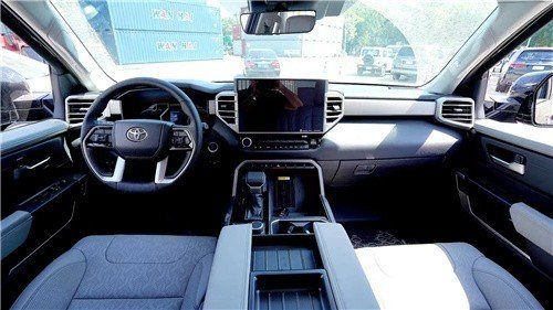22款丰田坦途3.5TT的座椅提供有皮质包裹,整体的造型也非常宽大,在中央扶手区域的设计上也采用了非常方正的造型设计,并且可以看到前排的储物空间设计还是非常丰富的。