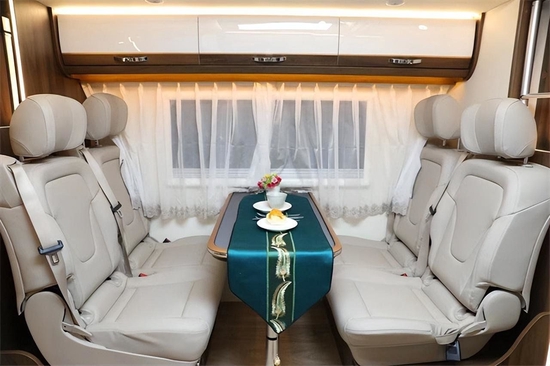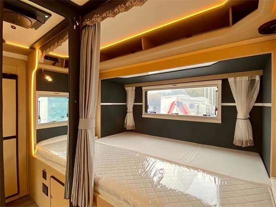 车内部还是采用了额头双人床+对座式奔驰原装双人座椅+车尾横置床的内饰布局。侧面和车尾部驻车时可扩展,扩大车内空间。会客区为4人座奔驰原装豪华沙发座椅+升降餐桌的组合。娱乐设备方面,车内安装了极米投影仪,JBL音响,打造您的房车影院。尾部的双人床打开拓展后可睡2个成人。