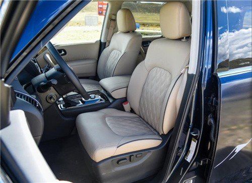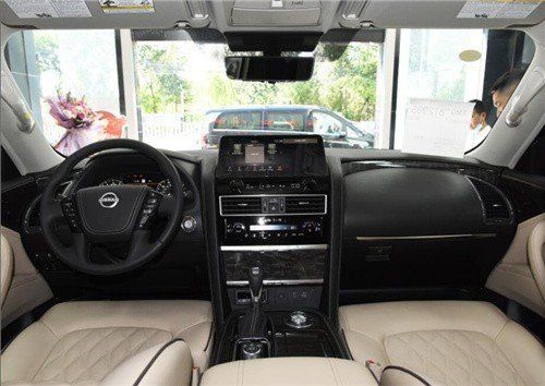 日产尼桑途乐5.6二排增加了中央扶手,充满了行政气息,再搭配咖色的菱形格真皮内饰,一显高档豪华,气场直逼高端品牌英菲尼迪。屏幕的下方依次为多媒体控制区、出风口和空调控制区,其中空调控制区采用了物理按键搭配液晶显示屏的设计,保证操作便利性的同时也提升了科技感。
