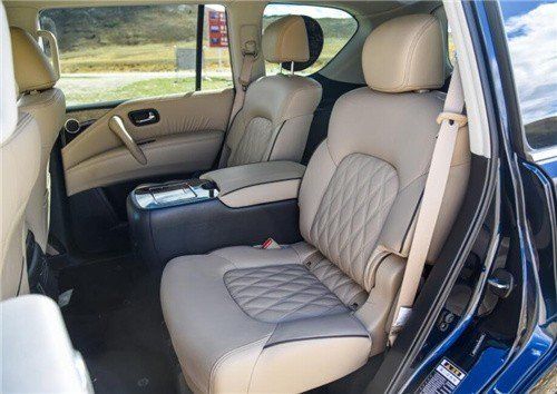 日产尼桑途乐5.6二排增加了中央扶手,充满了行政气息,再搭配咖色的菱形格真皮内饰,一显高档豪华,气场直逼高端品牌英菲尼迪。屏幕的下方依次为多媒体控制区、出风口和空调控制区,其中空调控制区采用了物理按键搭配液晶显示屏的设计,保证操作便利性的同时也提升了科技感。