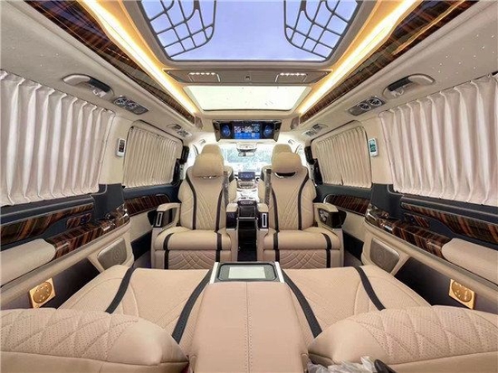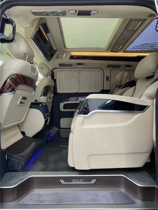 后舱二排座椅进行旋转,可以与第三排沙发座椅形成一个对卡座布局,瞬间形成移动办公室为我们切换到商务谈判模式。第三排座椅支持180平成床,为我们提供舒适的休息空间。本款奔驰V260L商务车的顶灯部分运用的是迈巴赫圆弧形顶灯设计,材质采用美国进口石英水晶,通过镶嵌式总控进行控制,三色可变,营造出舒适氛围。