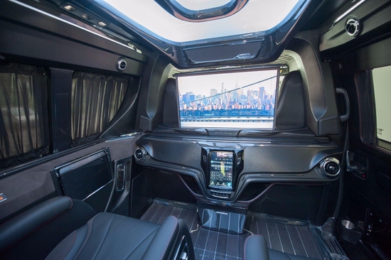 GMC商务之星为了让车内拥有娱乐办公功能,又能保持活跃气氛,设计团队费劲心思,打造了全新无全封闭式前后舱,仅用可升降液晶电视做隔档,既能放下隔档与驾驶舱愉悦交谈,也能升起电视休闲、工作一下。