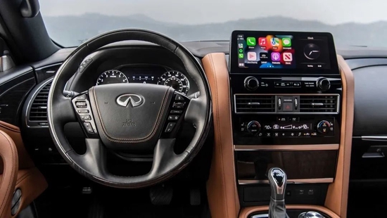 另外,通过观察可以看到位于触摸屏的下方,控制区方面也有所变化。新款QX80减少了更多的按键,把其他不常用的功能都移动到触摸屏上,在控制区只留下常用的几个按键和旋钮,比如音响系统和空调控制系统。在空调控制模块往下,则用一块木头饰板格挡开来,里面有一个点烟器以及一个无线充电模块,还有一个最大12V的供电插口。驾控方面也增加了一些小细节,比如QX80在原有的车道偏离预警系统中,加入了方向盘震动警告功能,极大地提升了行车安全性。