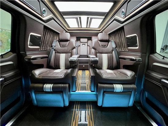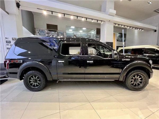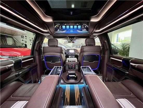 F-150 (配置|询价)高顶福特勇猛者是由进口的F150 LTD中规版为底盘改装的一款商务车,它承袭了F150超强动力,接实耐用的优点并且对其豪华性以及舒适性进行了大量提升。内部完全按照高端商务车的标准来打造。不仅有着硬派越野的超强动力,卓越的越野性能,霸气的体型,还拥有着高端商务车的豪华性,舒适性以及宽敞的内部空间。