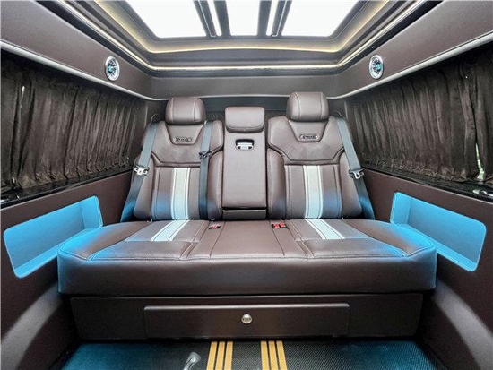 顶部半隔断的车载无线网络电视机,全车10个进口BO音响系统,再配合顶部天窗和后部的三色宫格顶灯相结合,搭配整车的线条式氛围灯,凸显整车的层次感,也烘托了整体的氛围。地板部分采用的是碳纤维风格的地板,档次十足。车内总体空间感十分宽敞,适用于商务接待或家庭旅行。--180+++1775++++1185