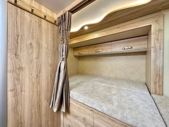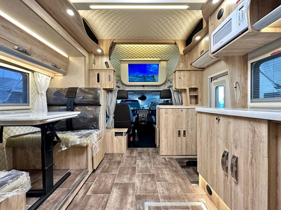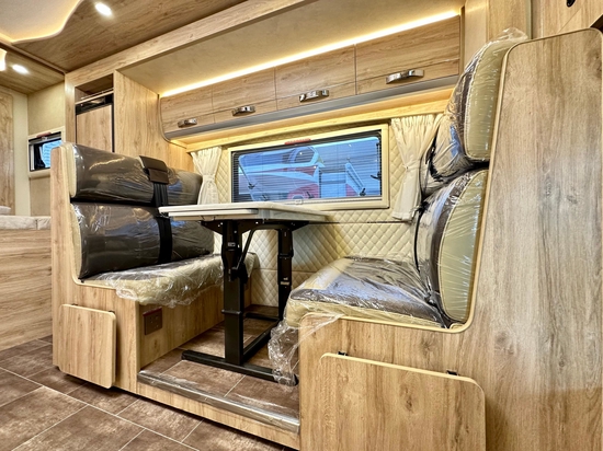 车内采用三菱的1.5P直流变频静音节能空调和伟巴斯特的进口驻车燃油暖风,方便驻车使用。还配备卡洛西进口行车冷风,增加驾驶的舒适度。会客区采用经典的四人对坐卡座样式,超大外推窗,增加了自然光照入车内的面积,桌面上搭上一块碎花桌布,阳光照耀,摆上下午茶点心,颇有美式田园生活的感觉;座椅的上方有丰富的储物空间。升降桌降下与对坐沙发可以拼成一张1900*945(mm)的临时床位。