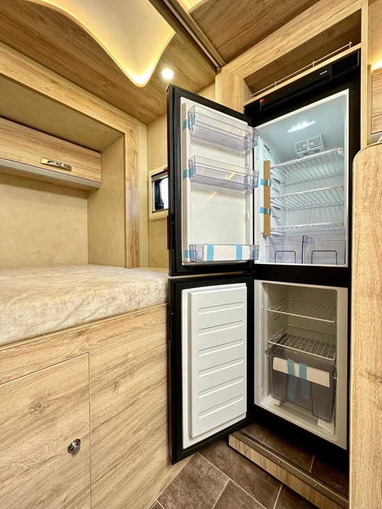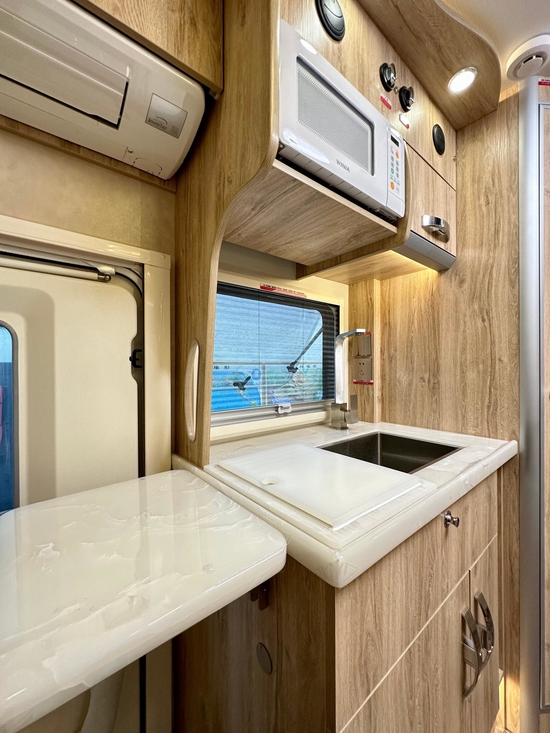 厨房区精致玉石台面配有洗菜池和米家电磁炉,上方配有微波炉,可以加热食物。下方配有双向抽屉,从外部也可拿取。当然,如果觉得厨艺室内的厨房不够自我发挥,还可以和外设的户外灶台配合使用。卡座的后方还安装了赛特福德的双开门冰箱,最大容积152L,包括冷藏室和冷冻室,乘客可以分区存放新鲜的食材。
