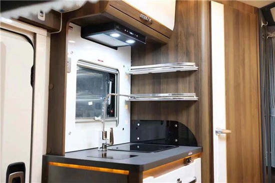 厨房区位于进门处,配有多美达水槽、电磁炉以及抽油烟机,置物架,可以放置日常使用的食材和调料,台面的上方和下方均做了储物空间的设计。配置方面,1.5匹的美的变频空调,四路监控,中央控制系统,3000W的充逆变一体机,800AH锂电池,800W的太阳能电池板。该车的净水箱为190L,灰水箱为80L,满足日常生活的需求。