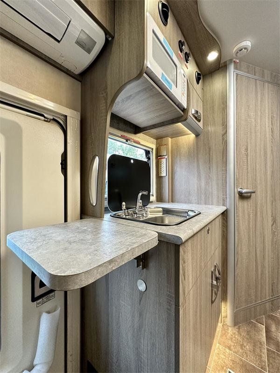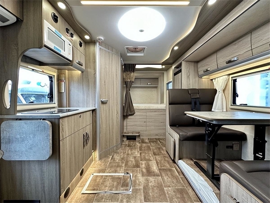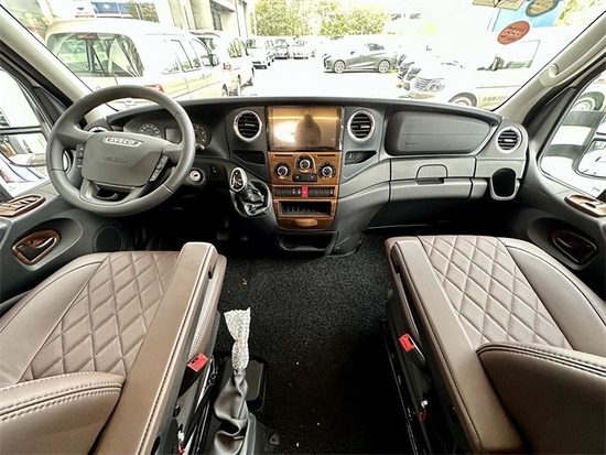 内部采用了E0级的环保板材,整车无异味,装饰看上去更为舒心;车内部分采用中式的家居风格,更符合中国人的审美,会客厅部分采用的是对座式沙发卡座的设计,直径达到了1.95m做到了行业内最宽,两个成年人面对面坐不会碰到腿。车内储物空间同样十分出色,会客厅上方拥有4组吊柜,后尾部3组,沙发卡座下方同样是储物空间,加上超大的储物仓大概拥有2500L的储物空间可供使用。
