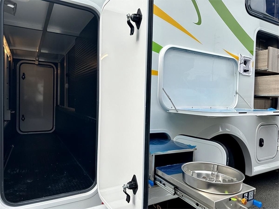 这款戴德自由风双拓PIUS是自由风双拓的升级版,外观清新亮丽。采用依维柯欧胜 (配置|询价)国六底盘,原厂装配有空气悬挂,动力方面搭载3.0T柴油发动机8AT手自一体变速箱,并且标配空气悬挂为我们行车过程中提供了行车安全性。整车外部配电动踏板、菲亚玛遮阳棚、市电接口、注水口、外置抽拉灶、折叠台面、可外抽拉柜体、储物舱门等,都是简单而又实用的设计。车尾部是备胎外挂。 外部注水口也是这款车的一个亮点,不仅标配有重力加水口,还拥有自吸加水口以及外置电源接口,使我们在户外可以很方便的使用水电。