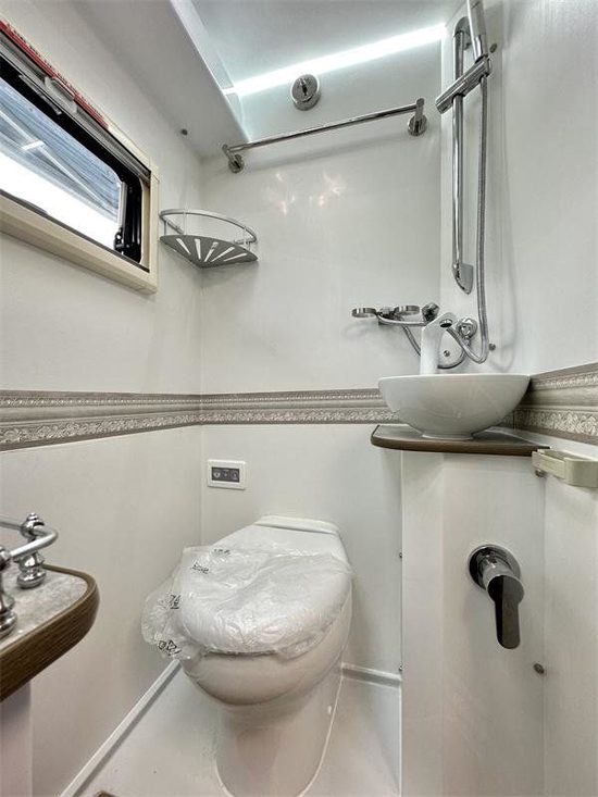 当然出门旅行的时候也可以自带充足的食材和饮品,152L的塞特福德双开门冰箱完全放得下,冰箱位于会客厅的一侧。冷藏冷冻均可。电器其他配置方面,配有房车智能控制系统、三菱重工1.5P静音变频投影面板空调、4路监控,32寸电视(车头翻转)、进口卡洛西行车冷暖风机、行车冷暖风+驻车燃油燃油暖风系统等。