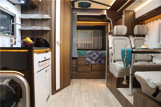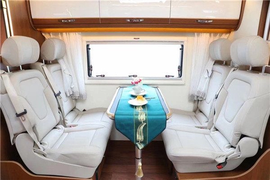 车身内部采用北欧风格的装饰,明亮、简约、大气。车厢中部会客区设有双人对坐沙发卡座上方带有符合国际标准的儿童座椅插口,上方配有多组储物柜,卡座中部升降桌放下后可拼成床铺,外出旅行时可以睡两名儿童;卡座沙发后方则是一台152L赛特福德房车专用冰箱,冷藏冷冻都可以,不用担心食物变质,安全可靠。