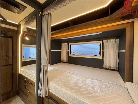 进入车内,内饰采用米白和深木色设计,搭配顶部的暖色灯光,奢华感十足。深棕木纹豪华家具组加上进口地板,典雅大方,带来高品质的旅居生活环境。驾驶舱和生活区之间安装有高档隐私帘,保障生活区隐私。驾驶室上方配有额头床,可供两人休憩。顶部和两边配有外推窗,加强空气流通的同时,也能为室内带来更多明亮光线。秋冬季节天气寒冷,车内还配置有三菱重工1.5P变频分体式空调,温度适宜、节能环保。