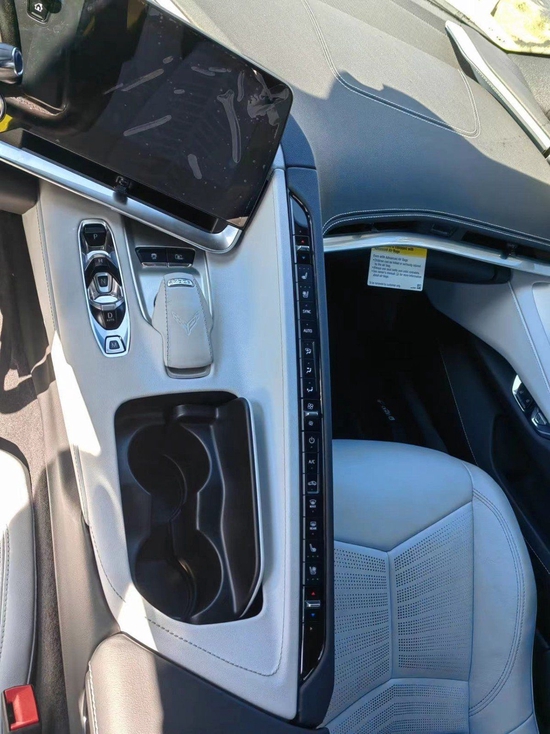 在车尾部分,醒目的尾翼造型,标志性的双色浮雕式尾灯结构等都没有大的变化,但后保险杠部分采用了双边四出排气,而并非Z06车型的中置四出,换了一种方式诠释科尔维特系列应有的运动感。在内饰部分,新车的设计层面当然不会有大的调整,依旧采用了这一代车型标志性的环抱感极强的设计理念,整个驾驶位几乎被四面八方包裹,与副驾驶侧完全分割开来,大幅度偏转的副驾驶几乎看不到的中控屏幕,大面积碳纤维面板装饰的有独特按钮的中央扶手箱前端区域等细节,加上上下双屏的碳纤维方向盘,翻毛皮车顶等元素,体现出了与欧系跑车截然不同的既视感。
