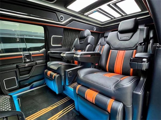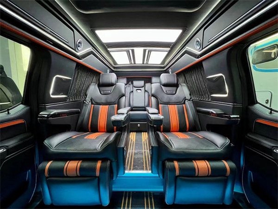 第二排搭载的是两张航空头等舱座椅,拥有12项电动调节,通风加热按摩脚托腰托甚至是座椅上下调节都应有尽有,地板部分采用的是碳纤维风格地板,档次十足,顶部有一个定制的顶灯,它有三款颜色可以随意的切换,适用于不同的车内场景,展现出不同的氛围感。车内总体空间感十分宽敞,适用于商务接待或家庭旅行。