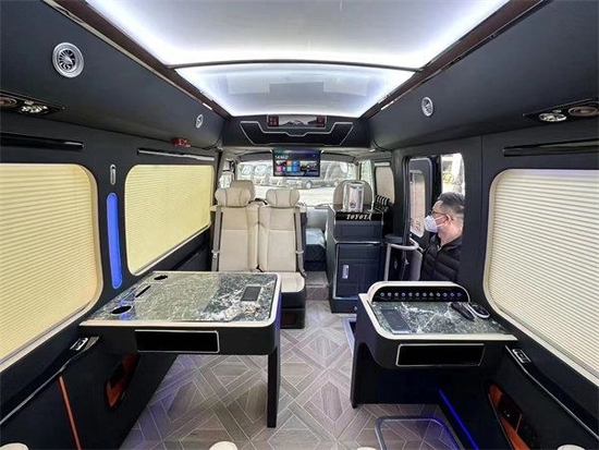 高档办公桌双人汇报新,并且配备了方便的电脑以及手机充电接口,方便而又安全。丰田考斯特改装商务车在内饰的设计上充分考虑了作为商务车的实用性和尊贵舒适的考虑,贴心的设计带给我们舒适的与众不同的体验。