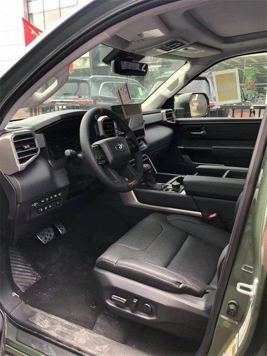 22款全新丰田坦途TRD版皮卡车内乘坐、后排座椅宽大,足以满足身高195cm的贵宾,第二排座椅可以完全折叠收起,为乘客提供更宽敞的腿部空间,已经达到了中大型车的水平,完全可以满足舒适乘坐的需求,部分特殊的装载给您的路途更添信心。