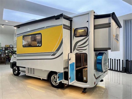 全车的长宽高为5990*2490*3180mm,同时还配置了较为丰富的生活配置,包括车身右侧的电动遮阳棚、外置翻板以及一个外置的小餐桌,里面还带有可双向抽拉的储物抽屉,平时天气好的时候也可以打开遮阳棚选择在下方做饭聚餐,享受休闲的旅居生活。