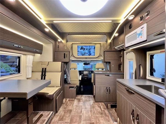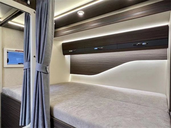 车内采用中式的家居风格,符合大多数人的审美,会客厅部分采用的是对座式沙发卡座的设计,直径达到了1.95m,即便两个成年人对立而坐也不会碰腿。车内储物空间由会客厅上方4组吊柜,后尾部3组,沙发卡座下方储物空间,尾部贯穿式储物仓大概拥有2500L的储物空间可供使用。