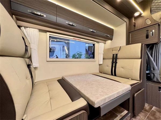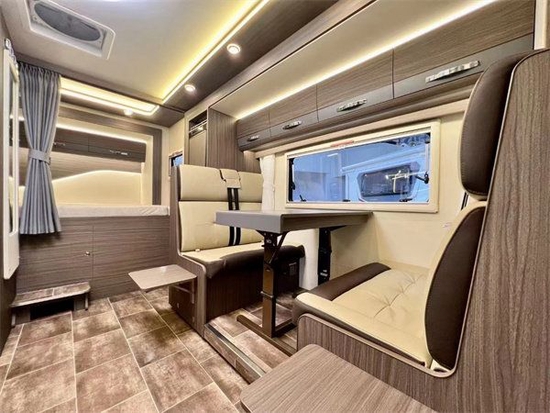 车内采用三菱的1.5P直流变频静音节能空调和伟巴斯特的进口驻车燃油暖风,还配备卡洛西进口行车冷风,为长途旅行奠定基础。会客区采用经典的四人对坐卡座样式,超大外推窗,增加了自然光照入车内的面积,座椅的上方有丰富的储物空间。--180++1775++1185