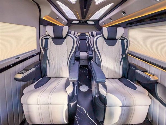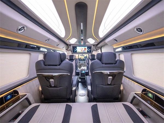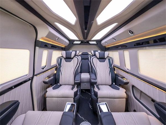 乘客舱配备了可360旋转的首长级航空座椅,拥有通风,加热,腰托等等功能,旋转过去之后再配备高档的办公桌版,提供了一个很好的娱乐空间或会议空间。充分体现了其人性化的设计以及对于乘车人员舒适度的考虑。