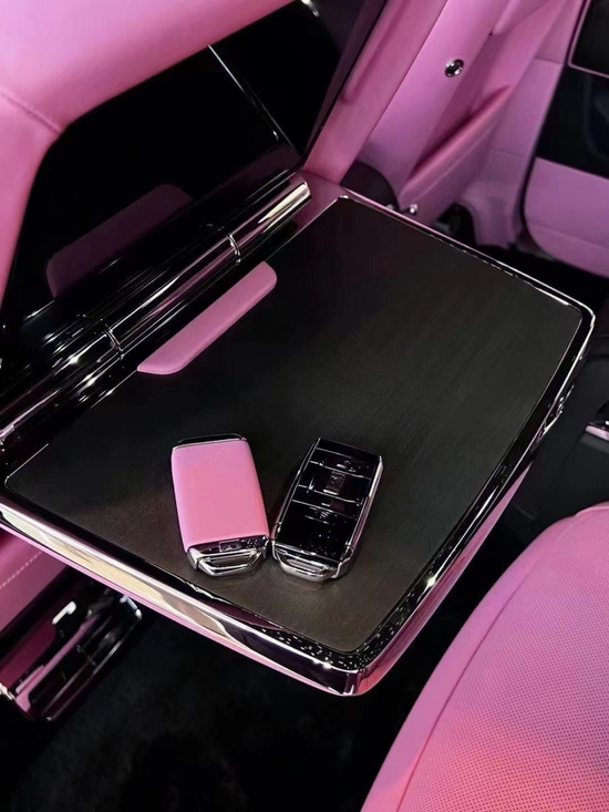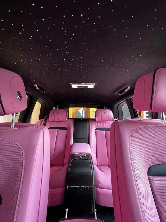 这辆定制的车型非常豪华,但是不得不说,车主一定是非常喜欢粉色,不然一般人还真是接受不了这种大面积粉色。库里南,顶级奢华SUV,车衣,升级原厂水晶标,四座星空顶,原厂定制粉色/粉黑双拼内饰,后娱、冰箱、定制音响齐全。你们喜欢吗!此车可以出shou!