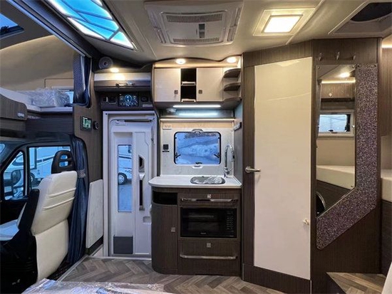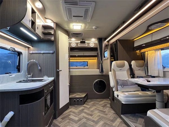 厨房位于乘客门右侧,一体式橱柜设计。白色料理台面,安装内嵌式洗菜盆与水龙头、另有直饮净水系统。上方集成式置物吊柜、半开放储物格,可分区放置不同用途的厨余物品。下方依旧具有可观的储物空间,全铝碗碟收纳架、放置锅具,碗筷不在话下。料理台下方内嵌一台多功能微波炉,可调节多种档位,日常解冻、加热食物非常方便。会客厅后方安装进口双开门房车专用冰箱,冷藏冷冻皆能满足,满足食材存储需求。
