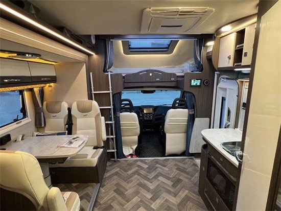 车内的娱乐活动或是用餐会客需要有充足的空间,中部会客区采用两排双人卡座对坐布局,中间搭配一张可自由调节高度的桌板,使用更方便舒适,顶部安装有一排储物吊柜,可以收纳旅途中常用的物品,行车时无需来回上下车取物。座椅侧边的外推窗视野宽阔,阳光照入车内,编制出光影变幻的画卷。