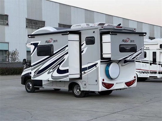 车身外漆面以浅灰色打底,辅以深蓝色、白色喷涂及彩贴,彰显大气时尚的气质;整车左侧、后侧分别配有进口拓展机构,和市场面上常见的拓展房车相比,拓出尺寸更大,使用空间及睡卧面积更加充足。