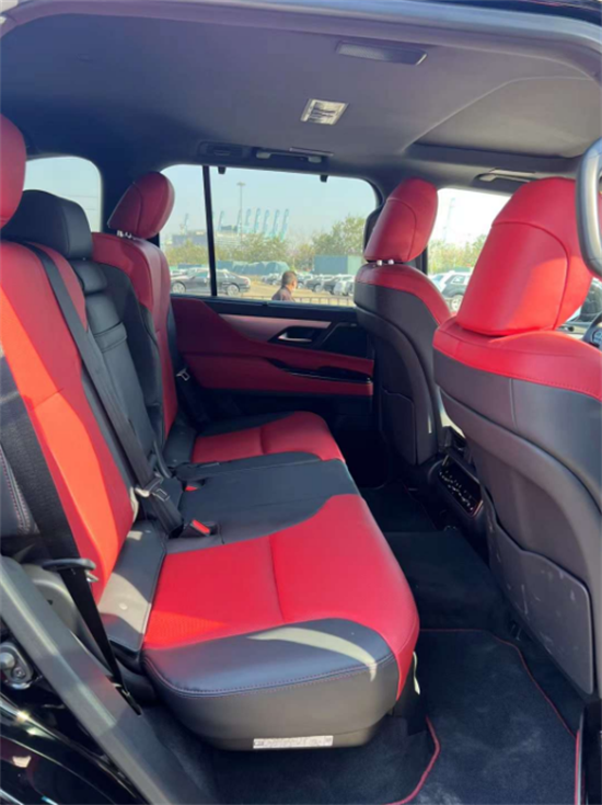 22款雷克萨斯LX600Sport运动版 黑车红内饰 22.6月 配置:无底升 7座 ,3.5tt双涡轮发动机,10速变速箱,换挡拨片,P265/50R22轮胎,lexue运动包围,后排手动遮阳帘,半苯胺真皮座椅,25扬声器马克莱文森高级扬声器,铝制内饰条,2排座椅通风,扭矩感应限滑差速器,前平衡杆,驾驶模式选择,智能卡,电尾门带脚感,无线充电,环影,盲点检测,lexus 2.5安全系统,车道辅助,前碰撞预警,交叉口左转辅助,自动远光灯,预碰撞行人和自行车监测,车道偏离预警带方向辅助,全速域动态雷达巡航系统,紧急避让,蓝牙,无线carplay,Lexus助手,12.3英寸触摸屏,前座椅通风加热,前排座椅4向腰部调节,10向驾驶座调节,3排座椅,座椅记忆,真皮包裹方向盘带加热,防眩目后视镜,拖车轨迹控制,坡道起步,下坡辅助,多地型选择,蠕行模式,大灯清洗,高级三光led头灯,雨感雨刷器,雨刷除冰,天窗,后扰流板,挡泥板!