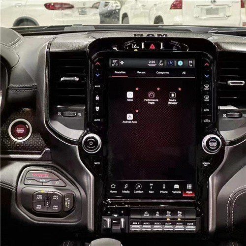 道奇霸王龙设计上还是延续了美式那种比较粗犷的风格,规整的中控台设计看上去比较死板,但丰富的配置会让你不由得为其称赞。中控台的设计简洁硬派,符合公羊的气质。仪表盘底边有花纹,则更加凸显了这款车的文雅性。软性材质的仪表台设计,摸上去手感非常舒服,并无些许生硬之处。