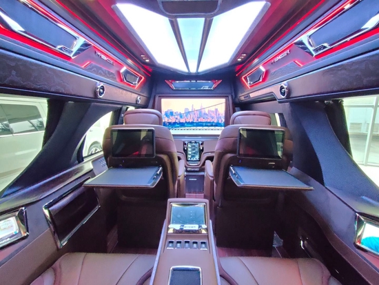 GMC商务之星商务中不失科技感,大型瀑布式中控台、非对称式侧墙造型、后排流线型护围、悬浮式扶手台、顶级Harman音响、40“液晶电视、4G移动Wi-Fi、视频会议系统、车载电热水壶、电动折叠桌板、豪华车载冰箱、內镶式电动酒柜、前后路况监视系统,车内电器均可由液晶触摸屏控制,商务功能一应俱全。