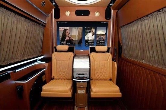 既可以定制,也可以有现房、样本房,哦不对,是现车和样车。文中图片是个性化定制好的实车,布局风格采用的是经典的7+2布局方式。整车核载7人,驾驶舱与后面的商务舱通过隔断隔开,给后面的商务舱提供了私密空间。但又没完全隔开,因为宽屏曲面网络电视是可以升降的,降下来之后,前后舱可以直接沟通。一体式的吧台隐藏着两个翻折式座椅,可供航空椅上的老板放脚用,也可以临时开会对坐用。对坐当然少不了收缩式的小圆桌。联系电话:18812637416刘经理 (同号微信)