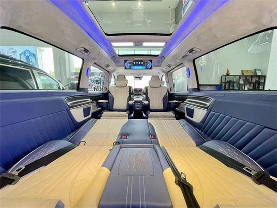 后舱二排座椅进行旋转,可以与第三排沙发座椅形成一个对卡座布局,瞬间形成移动办公室为我们切换到商务谈判模式。第三排座椅支持180平成床,为我们提供舒适的休息空间。本款奔驰V260L商务车的顶灯部分运用的是迈巴赫圆弧形顶灯设计,材质采用美国进口石英水晶,通过镶嵌式总控进行控制,三色可变,营造出舒适氛围。