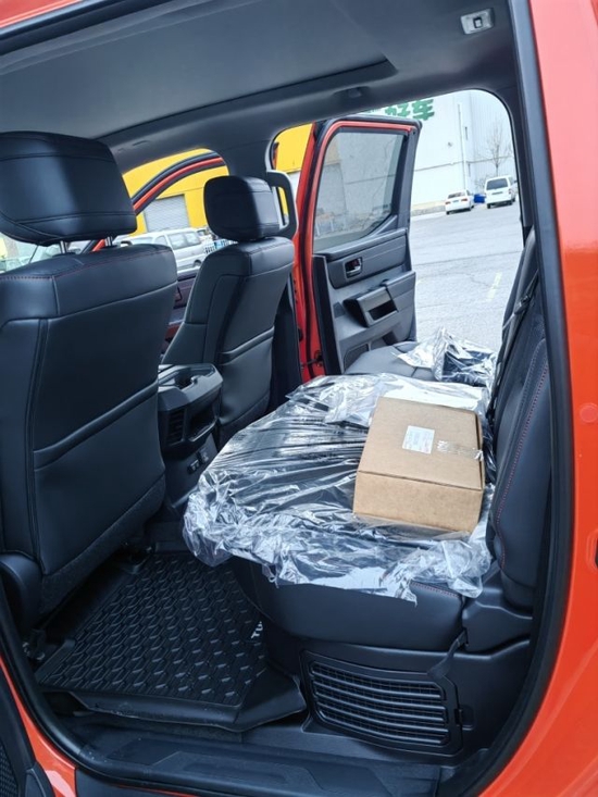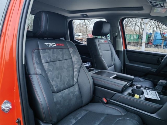 新款丰田坦途3.5TT座椅提供有皮质包裹,整体的造型也非常宽大,在中央扶手区域的设计上也采用了非常方正的造型设计,并且可以看到前排的储物空间设计还是非常丰富的。