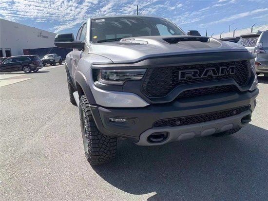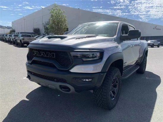 22款道奇公羊霸王龙TRX国六最新款新车传承了道奇Ram家族高大威猛的造型设计,同时细节部分融入了更多高性能元素,包括经过黑化处理的前格栅,引擎盖两侧的黑色进气口,霸王龙 以及为了容纳巨大的机械增压器而设计的通风口等等。此外,新车还配备了视觉冲击力更强的黑色轮眉和外露式的拖车钩,看上去十分霸气。