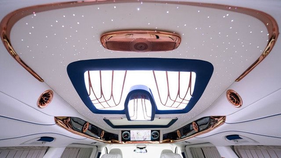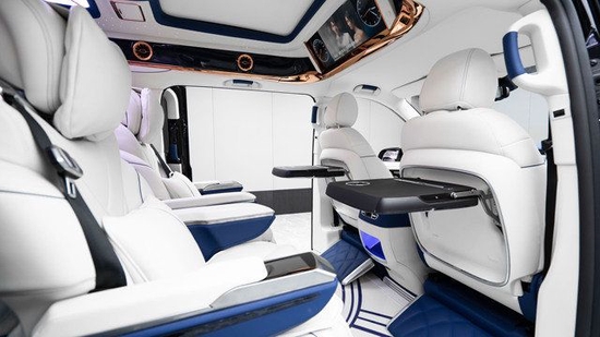 2023款奔驰V250商务车内饰方面同样做了整体的升级,中控台、方向盘、门板、车侧壁、车顶、进门的踏步整体升级包覆。正副驾驶座椅升级包覆、正副驾驶座椅中间加装车载扶手冰箱、正副驾驶座椅头顶定制宽屏车载网络电视、正副驾驶座椅椅背后方加装可伸缩的小桌板。第二排座椅升级成两个独立的航空座椅,航空座椅带多向电动调节功能,带通风、加热、按摩等舒适功能、同时航空座椅还带有选装功能,旋转之后可与第三排座椅形成对坐状态。第三排座椅升级成宽大舒适的三联排沙发床,可电动调节、前后移动,靠背可180度放平平卧。