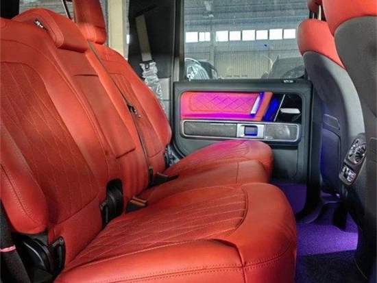 2023款奔驰G63中控台采用大量银色金属亮条搭配与中央手扶箱融为一体,虚拟的仪表盘与中控12.3英寸液晶屏融为一体颇具时尚气息,中控涡扇式空调出风口也颇具设计感,车内的高档皮革内饰以及标有V12钻石图案设计的座椅、车门面板和脚垫,无不彰显着车主的尊贵身份!