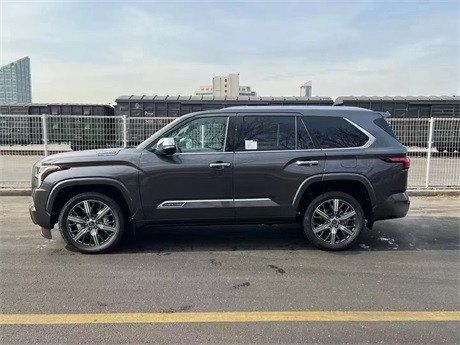 2023款丰田红杉新车侧面造型硬朗修长,各种凌厉的车身线条彰显肌肉属性,并且颇具机甲风的感觉。A柱到C柱都做了隐藏式设计,营造出动感的半悬浮式车顶的效果,前后轮拱外凸,同色车身轮眉,并且配备了22英寸铝合金轮辋。