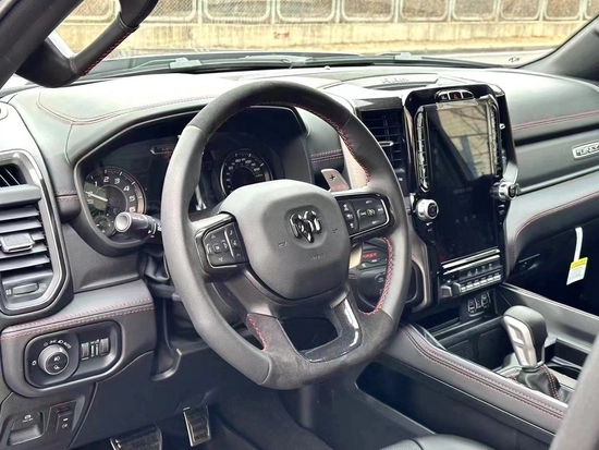 2023款道奇公羊霸王龙TRX内饰部分进一步强化了其高性能版本的形象,中控台和座椅随处可见的TRX标识便是最好的例证。同时作为道奇家族的旗舰车型,新车还配备了12英寸竖置中控屏幕除了支持蓝牙导航和车载Wi-Fi等常见功能还支持Apple CarPlay和Android Auto手机映射。